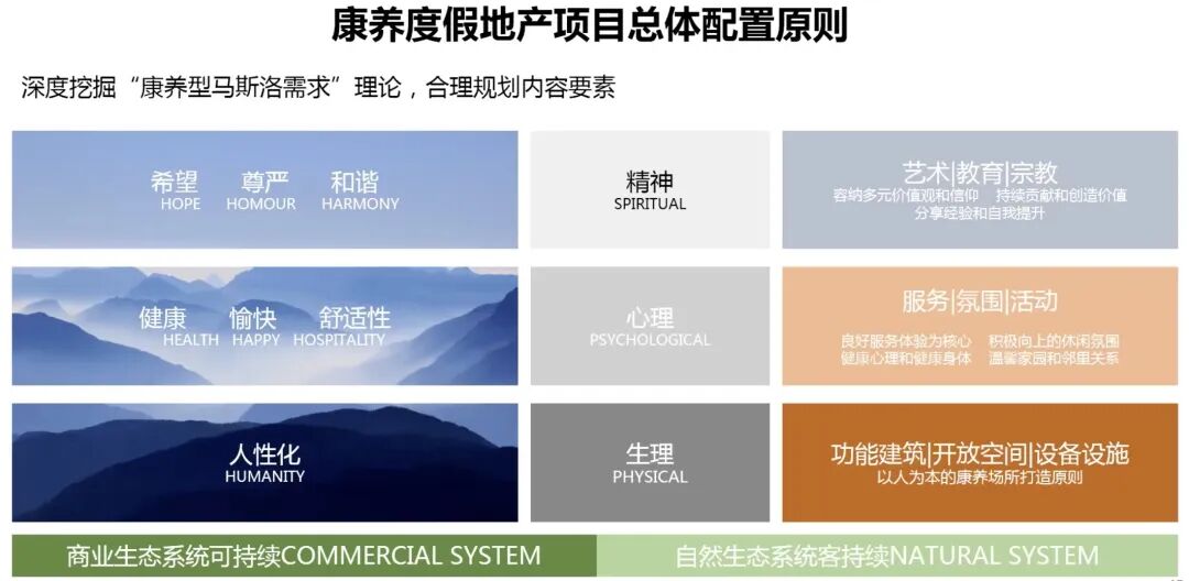 对于康养度假型的地产项目,客户不再需要身体上的单一照料,更重要的是进行身心灵的疗愈。所以,领易咨询团队在马斯洛需求理论上,对康养型项目进行了升级,分成了生理性需求、心理性需求和精神性需求,把三种需求分解到产品层面上来看,就包括了功能建筑、开放空间、基本的配套设施,以及所提供的服务,营造的氛围和知道的活动。最高层面的精神需求,需要有教育,甚至有宗教有精神上的关怀。