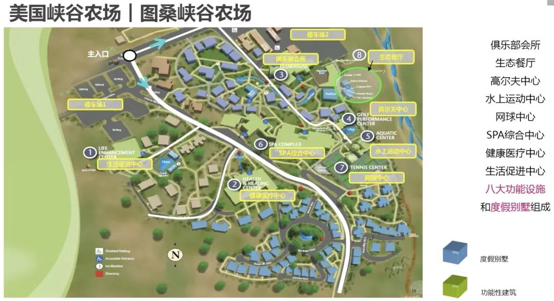 美国峡谷牧场模型的核心在于出售型物业进行了酒店化处理和运营,获得会员式消费。同时通过输入不同类型的身心灵健康型的功能性的产品,包括了spa中心,健康理疗中心、生活促进中心、高尔夫中心、水上运动中心、网球中心、生态餐厅、俱乐部会所等不同类型的设施。这些设施为度假型销售型产品进行赋能,住客选择多样化的居住产品,同时也享受不同套餐的课程式服务。