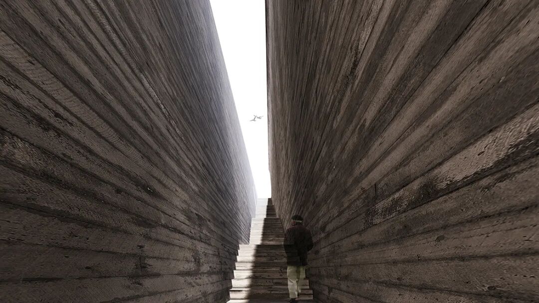 设计结合地形高差,呈现为几块斜插在坡地上,大小不一,包裹不同建筑功能且具有强烈纪念性仪式感的“风化巨石”。